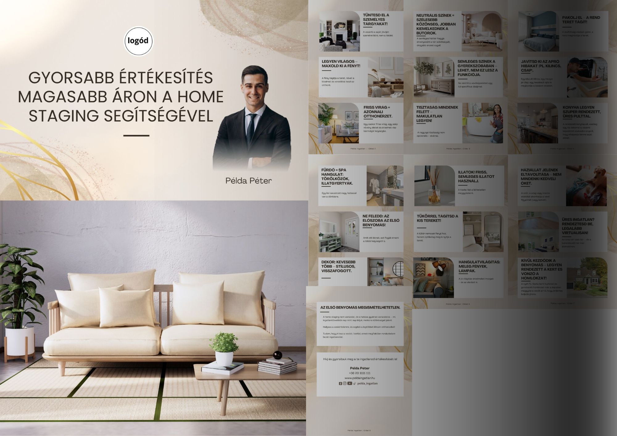 A mai piacon már nem az eladó dönti el, mi tetszik – a vevő elvárásaihoz kell igazítani az otthont. A home staging pontosan ebben segít: kiemelni az ingatlan előnyeit, elrejteni a hátrányokat, és olyan benyomást kelteni, amibe könnyű beleszeretni. Ez az érthetően megfogalmazott, vizuálisan igényes anyag segít abban, hogy a megbízód is átlássa a folyamatot és felismerje az értékét. Neked pedig nem kell újra és újra elmagyaráznod – elég átadnod ezt az anyagot. Ez nemcsak edukál, de növeli a megbízó elköteleződését is.